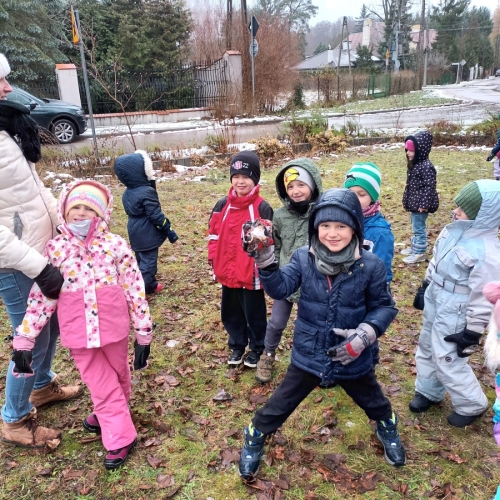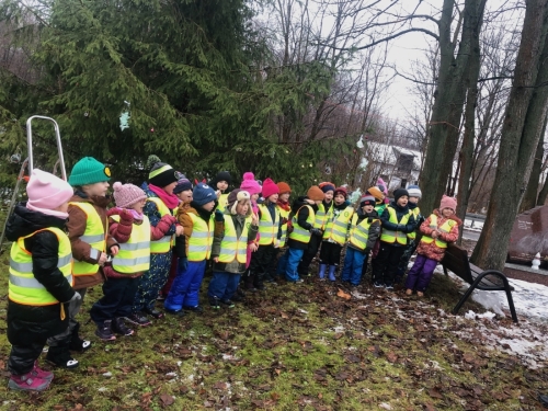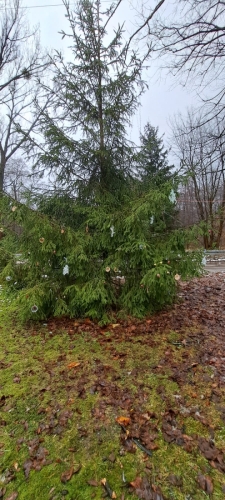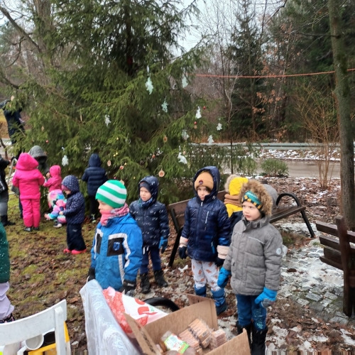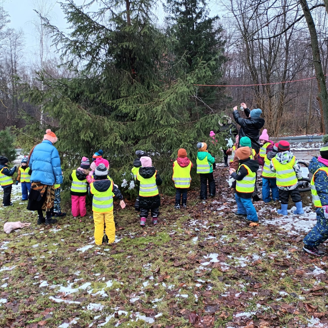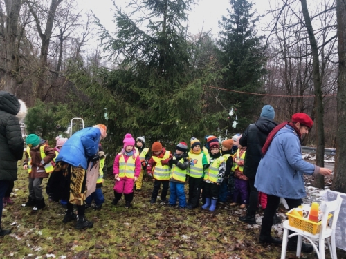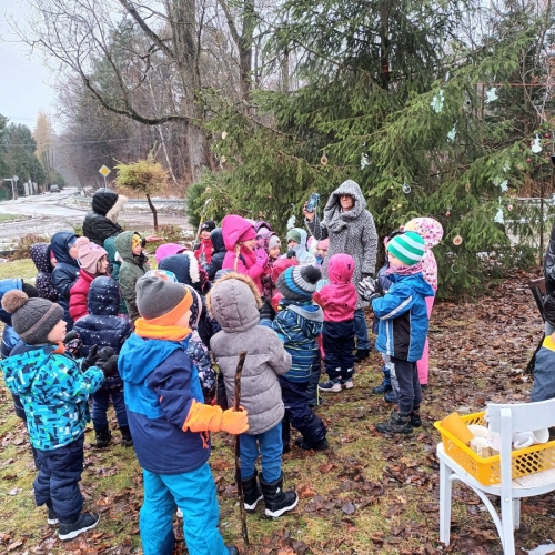 Rośnie piękna i rozłożysta na placyku przy kamieniu na Domance. W poniedziałek 11 grudnia o godz. 10:30 nie zważając na siąpiący a potem już mocno padający deszcz i przenikliwy chłód odwiedziły ją dzielne i wytrwałe dzieci z przedszkola Hula - Hop i Zegar Słoneczny. "To prawdziwi twardziele!" jak skomentowała to jedna z mam. Maluchy przy pomocy cioć i członków SPZG powiesiły na choince własnoręcznie wykonane ozdoby i zaśpiewały kolędy. Ciepły kompocik wigilijny przygotowany przez nieocenioną Jolę Jarosz pozwolił zapomnieć o chłodzie. Z herbatnikami w garści oraz ze słodkimi pierniczkami w buzi (dzięki ofiarności Top Marketu) w radosnym nastoju dzieci ruszyły w powrotną drogę do ciepłych i suchych przedszkoli. Wieczorem, gdy zapalają się latarnie, na choince rozbłyskają światełka dzięki czemu jest jeszcze piękniejsza. Każdy może dodać coś od siebie: bombkę, łańcuch czy też inną ozdobę, by nasza wspólna choinka cieszyła oko wszystkich mieszkańców.